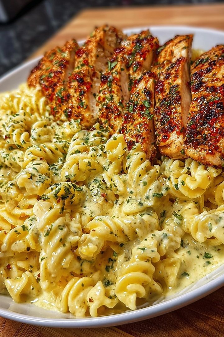 Creamy Garlic Parmesan Chicken with Cheesy Twisted Pasta