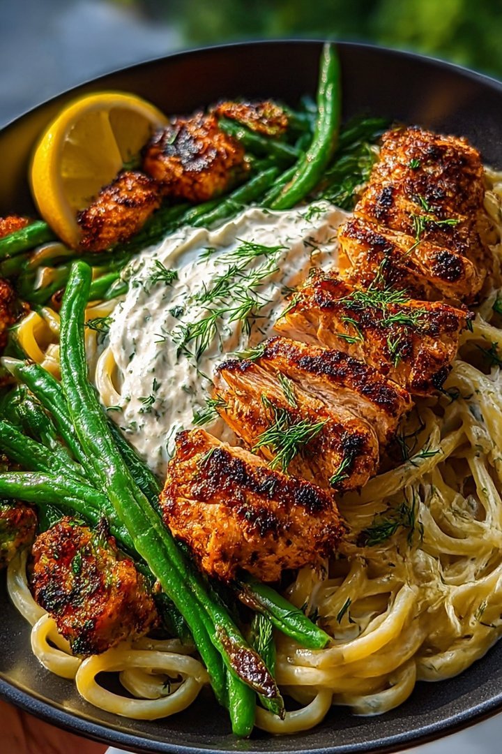 The aroma of smoky paprika mingling with creamy Alfredo sauce is an absolute symphony, wouldn’t you agree? Imagine that bright lemon feta whip that cuts through the richness, and those charred green beans that add just the right bit of a snappy texture.
